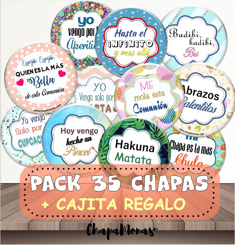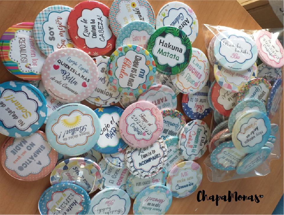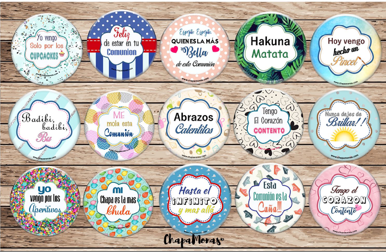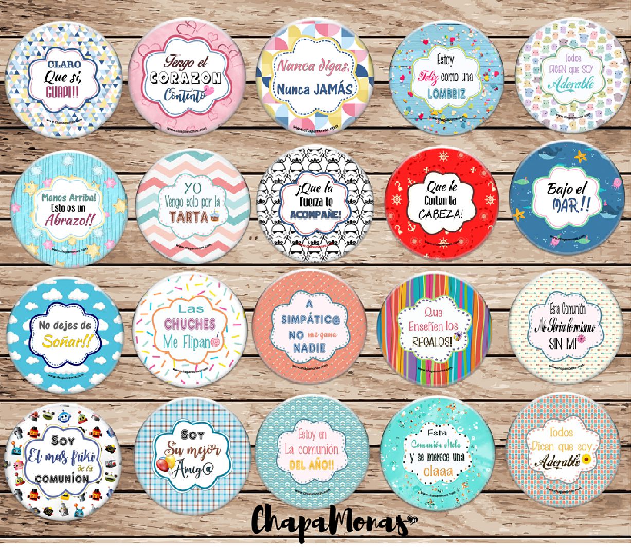Bonito y divertido pack de 35 Chapas de 59 mm o 75mm con Frases Divertidas para COMUNIONES!!!