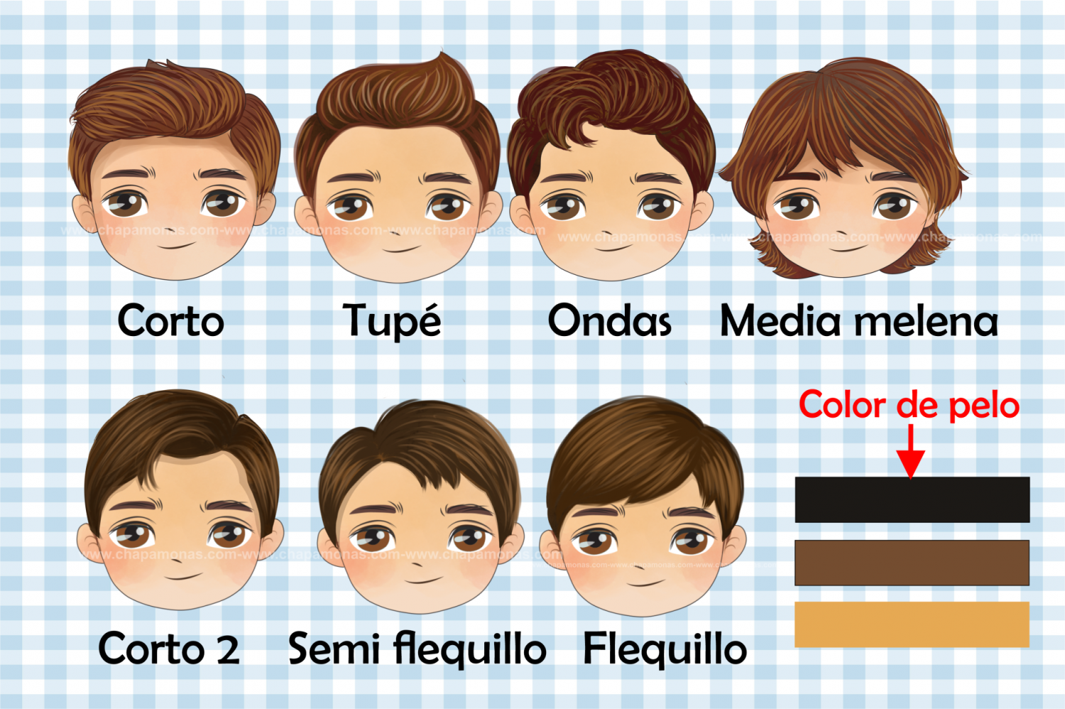 Indícanos en "Personalización del producto" Nombres, fecha, numero elegido de traje ( podrás verlos en las imágenes adicionales) Corte de pelo ( Tupe, Corto, Ondas, Media melena) Color de pelo y ojos, gafas en caso de que el niño las lleve y no olvides el texto o datos  a incluir de la parte trasera de la tableta ( Estos se podrán modificar o incluir a los Abuelos etc)