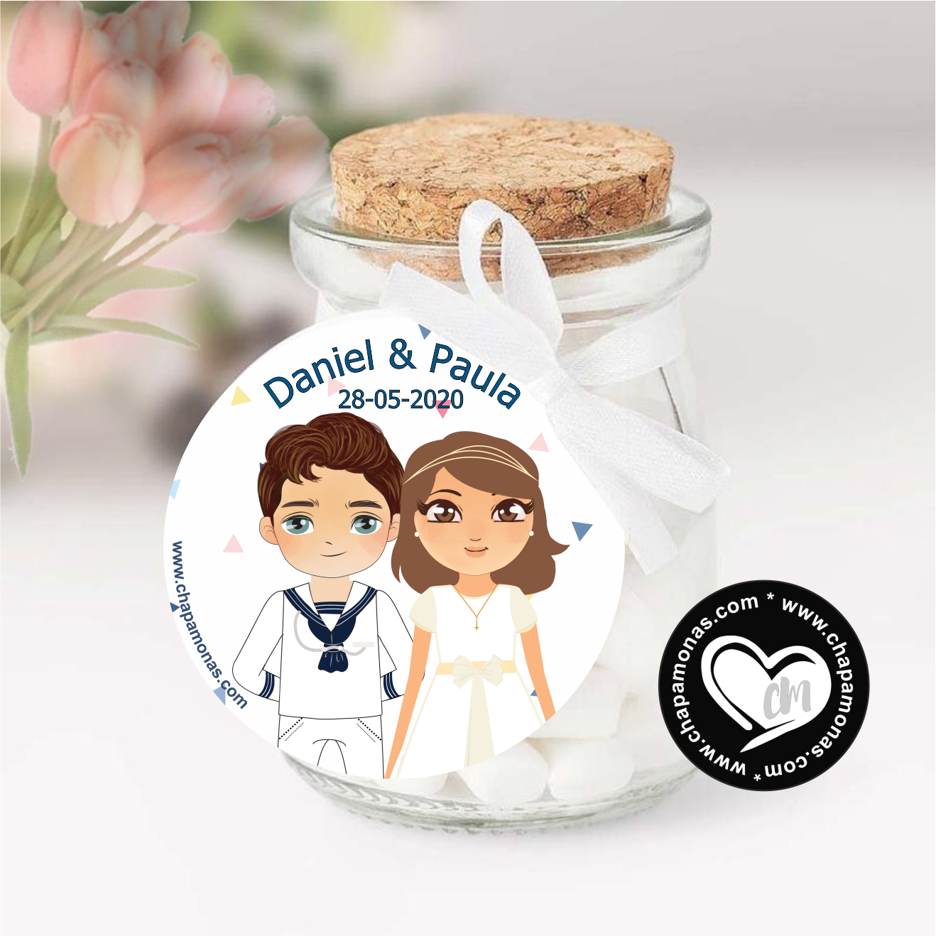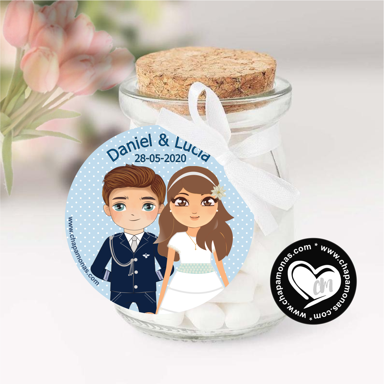 Etiquetas y pegatinas personalizables para mellizos con color de pelo y ojos especial para Comuniones, disponibles en circular perfectas para acompañar tus Chapitas, Detalles para los invitados, Mesas de dulces etc. Puedes incluir Nombres de los niños de la comunión, color de pelo, ojos y trajecito.