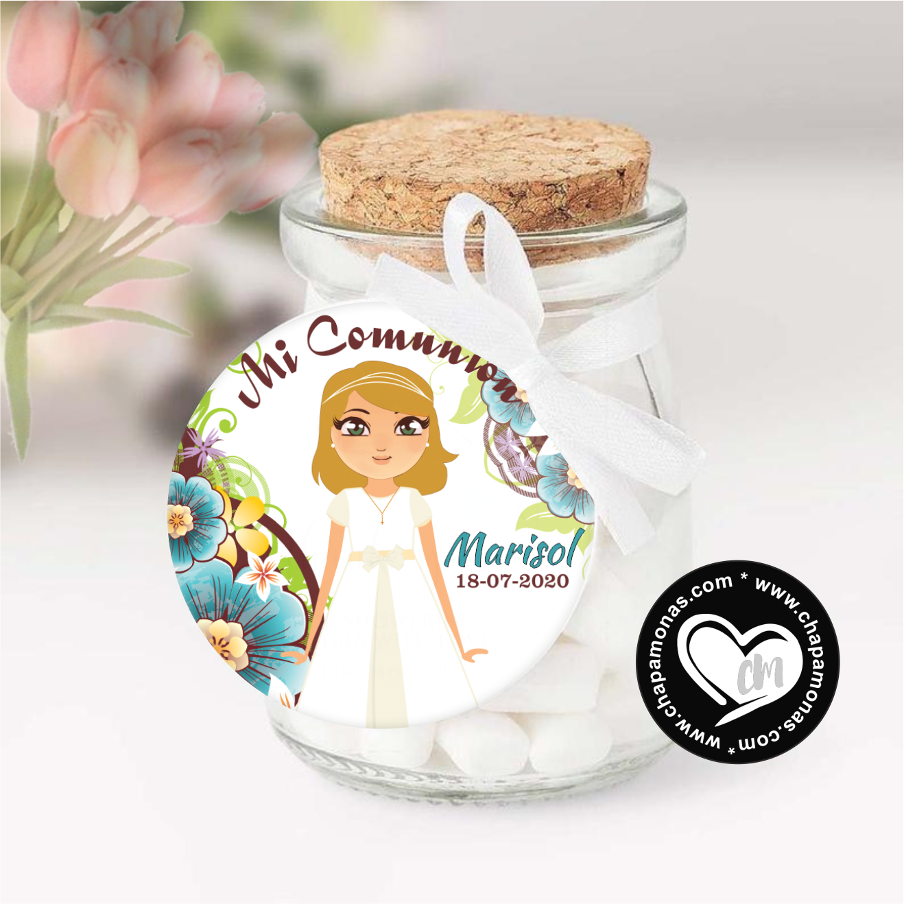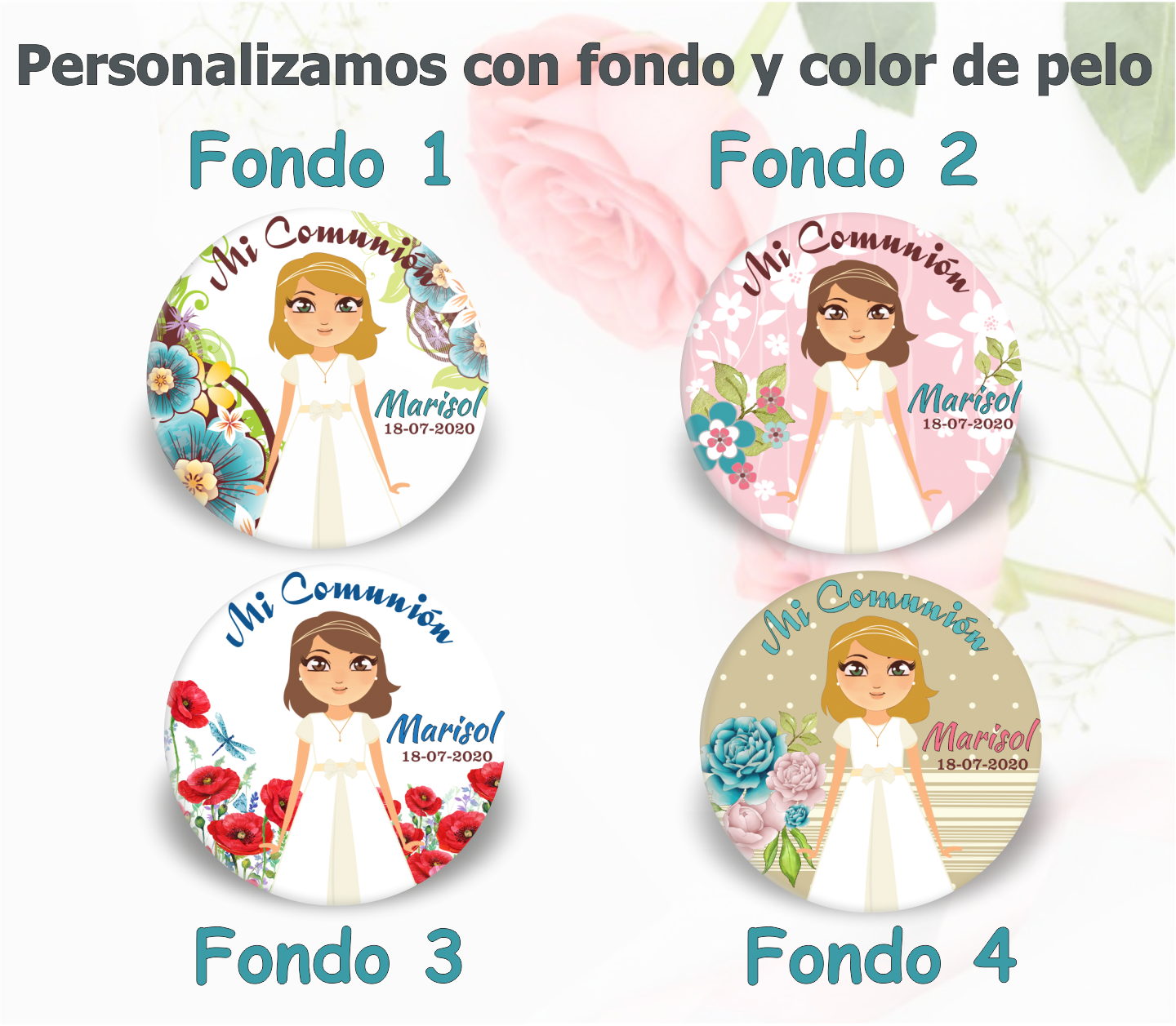 Etiquetas y pegatinas personalizables con color de pelo y ojos especial para Comuniones, disponibles en circular perfectas para acompañar tus Chapitas, Detalles para los invitados, Mesas de dulces etc. Puedes incluir Nombres de la niña de la comunión, fecha, color de pelo, ojos y fondo!!