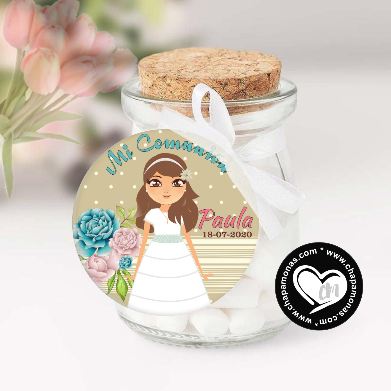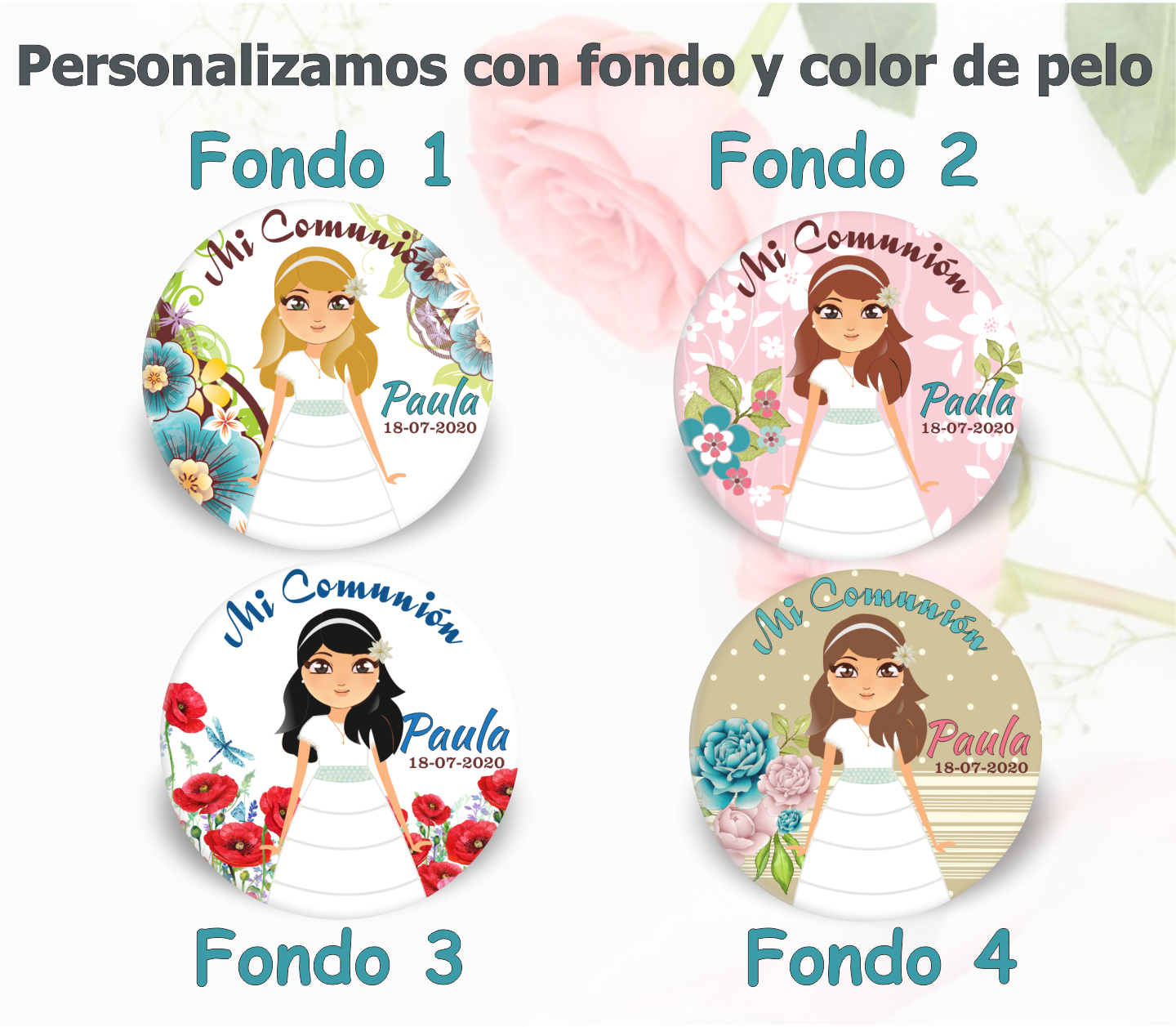 Etiquetas y pegatinas personalizables con color de pelo y ojos especial para Comuniones, disponibles en circular perfectas para acompañar tus Chapitas, Detalles para los invitados, Mesas de dulces etc. Puedes incluir Nombres de la niña de la comunión, fecha, color de pelo, ojos y fondo!!