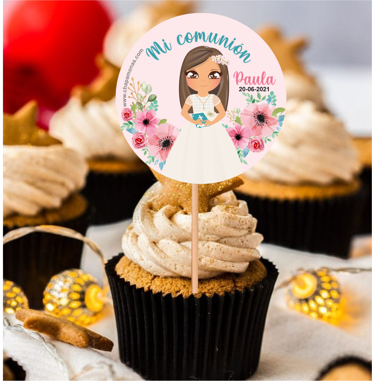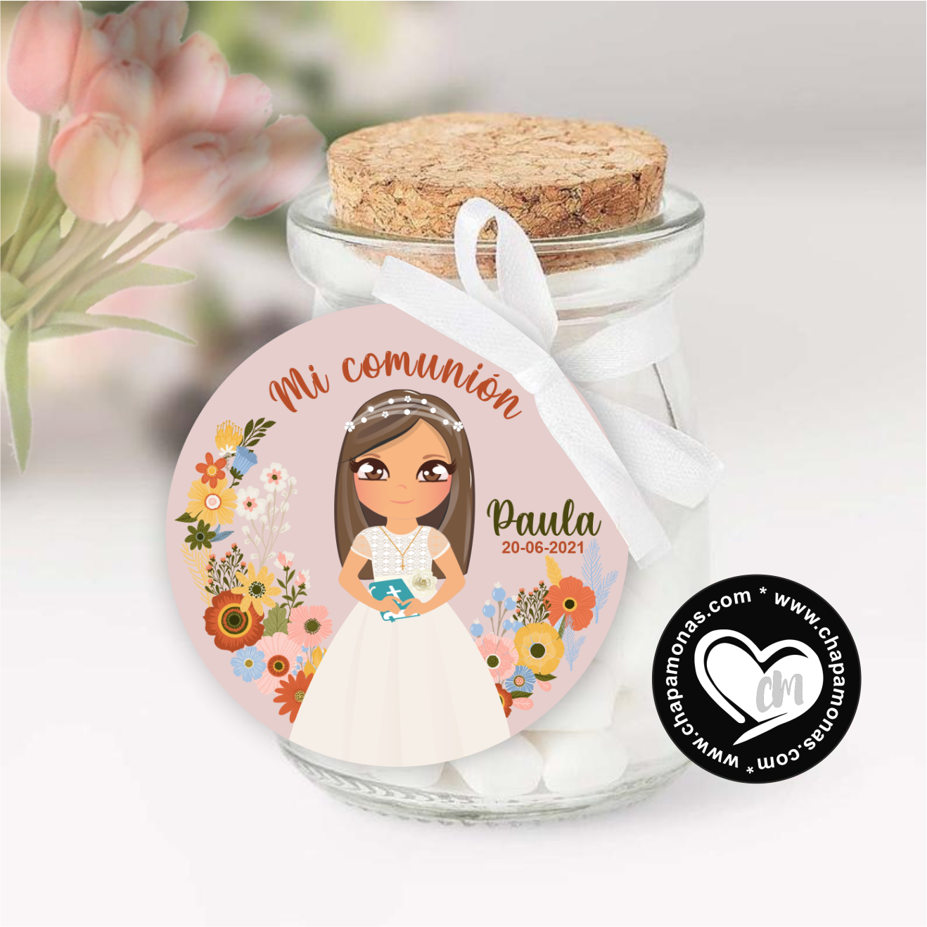 Etiquetas y pegatinas personalizables con muñequita de comunión, podremos personalizar el color de pelo, ojos, accesorios para el cabello y vestido igual que la niña que hace la comunión, disponibles en circular perfectas  para acompañar tus Chapitas, Detalles para los invitados, Mesas de dulces etc. Puedes incluir Nombres de la niña de la comunión, fecha, color de pelo, ojos y fondo!!
