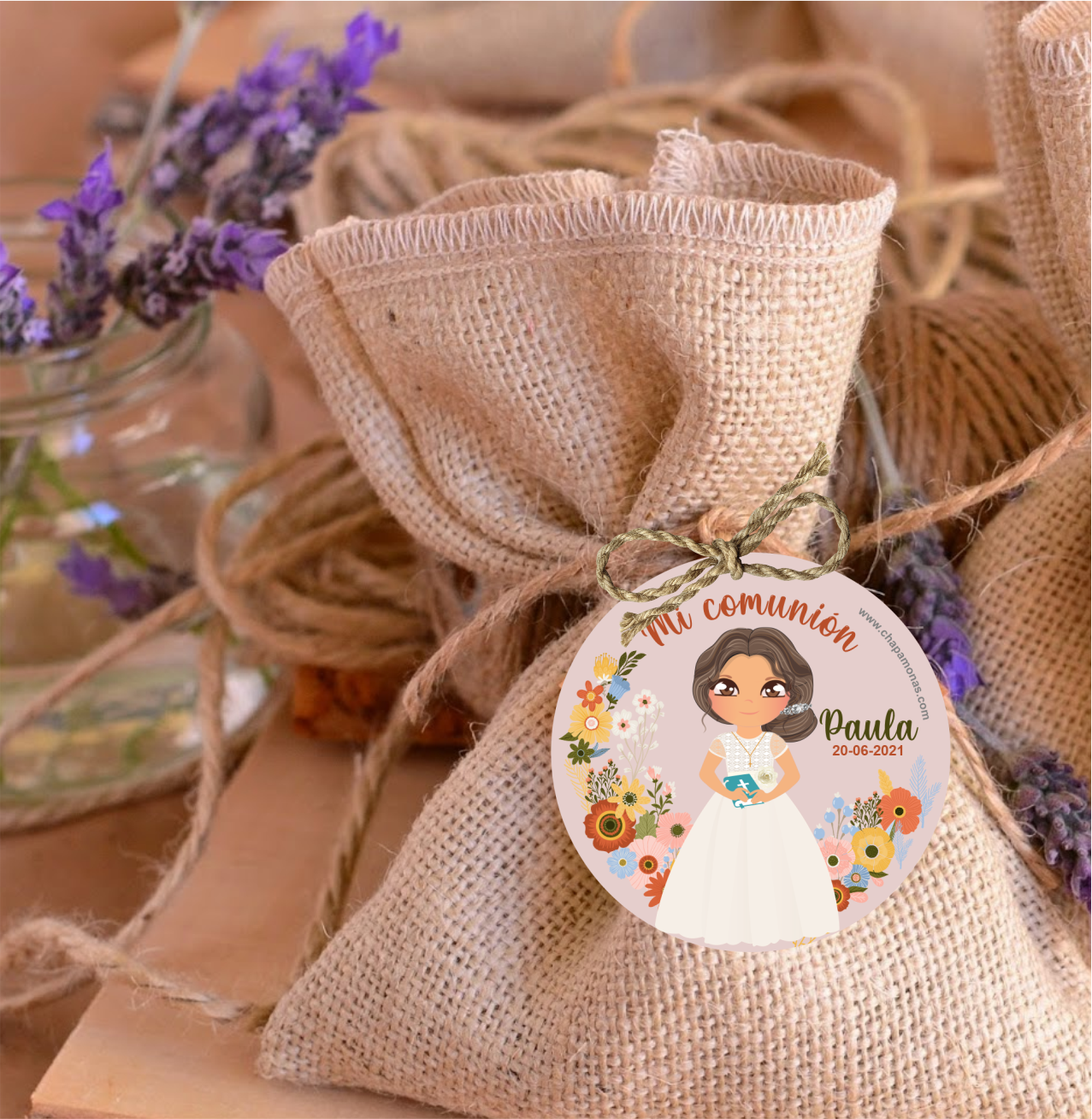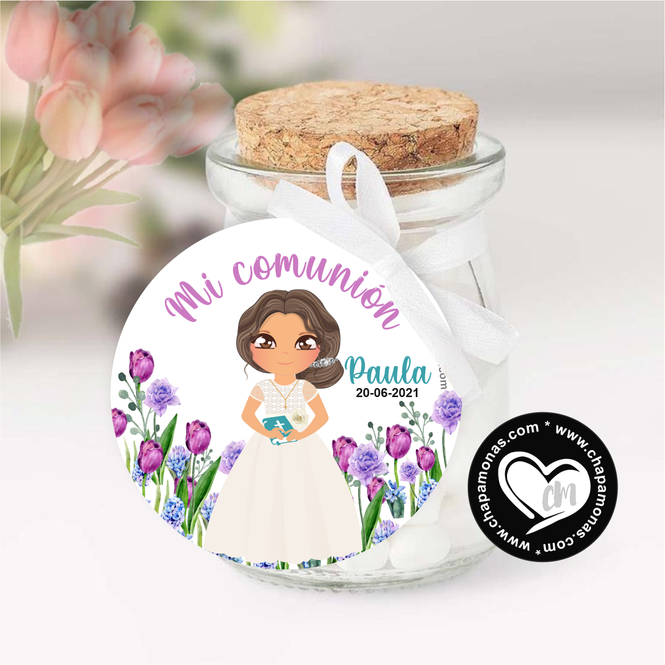 Etiquetas y pegatinas personalizables con muñequita de comunión, podremos personalizar el color de pelo, ojos, accesorios para el cabello y vestido igual que la niña que hace la comunión, disponibles en circular perfectas  para acompañar tus Chapitas, Detalles para los invitados, Mesas de dulces etc. Puedes incluir Nombres de la niña de la comunión, fecha, color de pelo, ojos y fondo!!