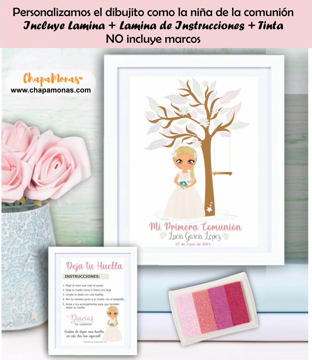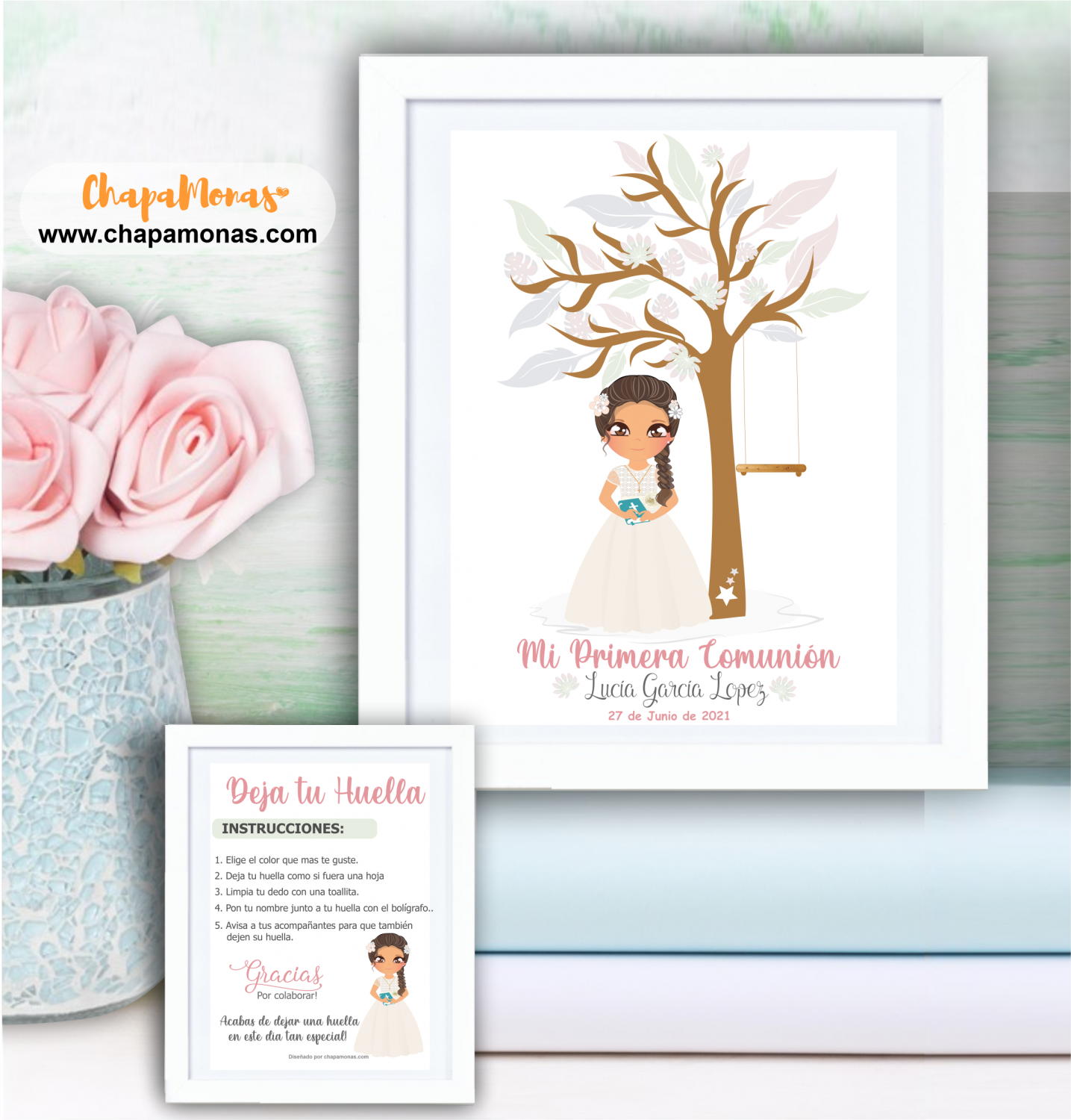 Original complemento para el día de la comunión de tu hija. Es una lámina totalmente personalizada en la cual podrás elegir el tamaño y que sirve para que todos los invitados y amigos dejen su huella en él.