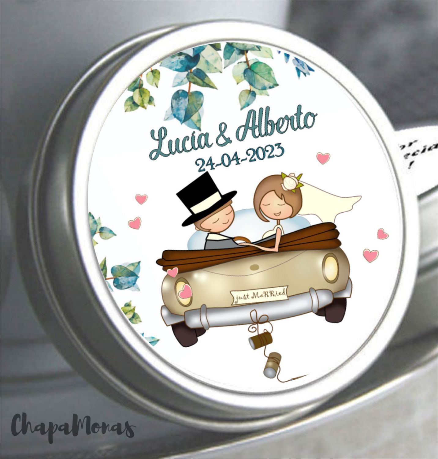 Indícanos en "personalización del producto" Nombres de los novios y fecha de la boda te enviaremos muestra por email o Whatssap del diseño con tus personalizaciones antes de proceder a la fabricación para confirmar que os gusta y esta todo correcto, Producto y pegatina de excelente calidad e impresión.