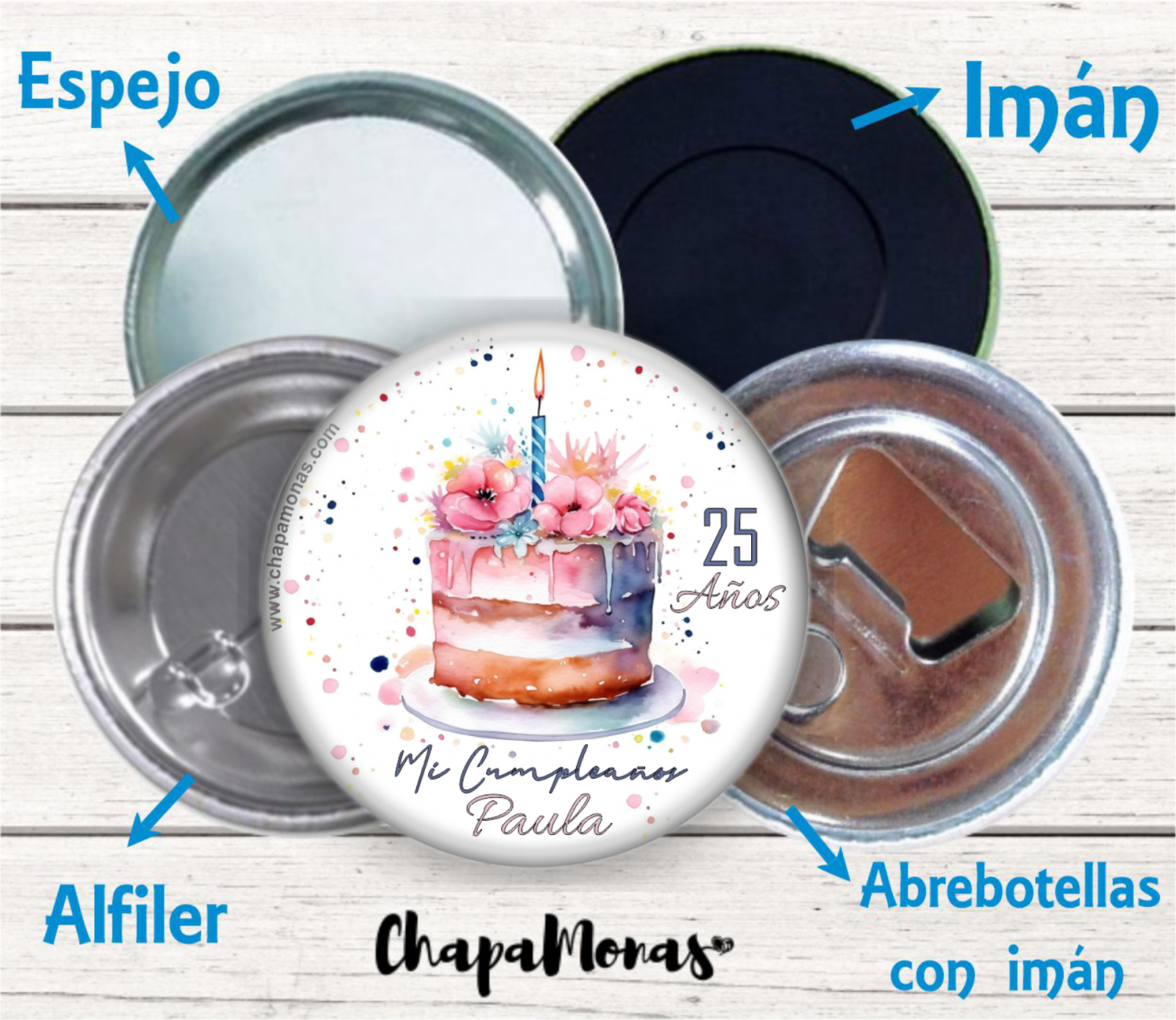 Podremos crear tus chapitas con la trasera en Imán, Abrebotellas con Imán, Espejito de Bolsillo o en Alfiler (seleccionalo en el desplegable)