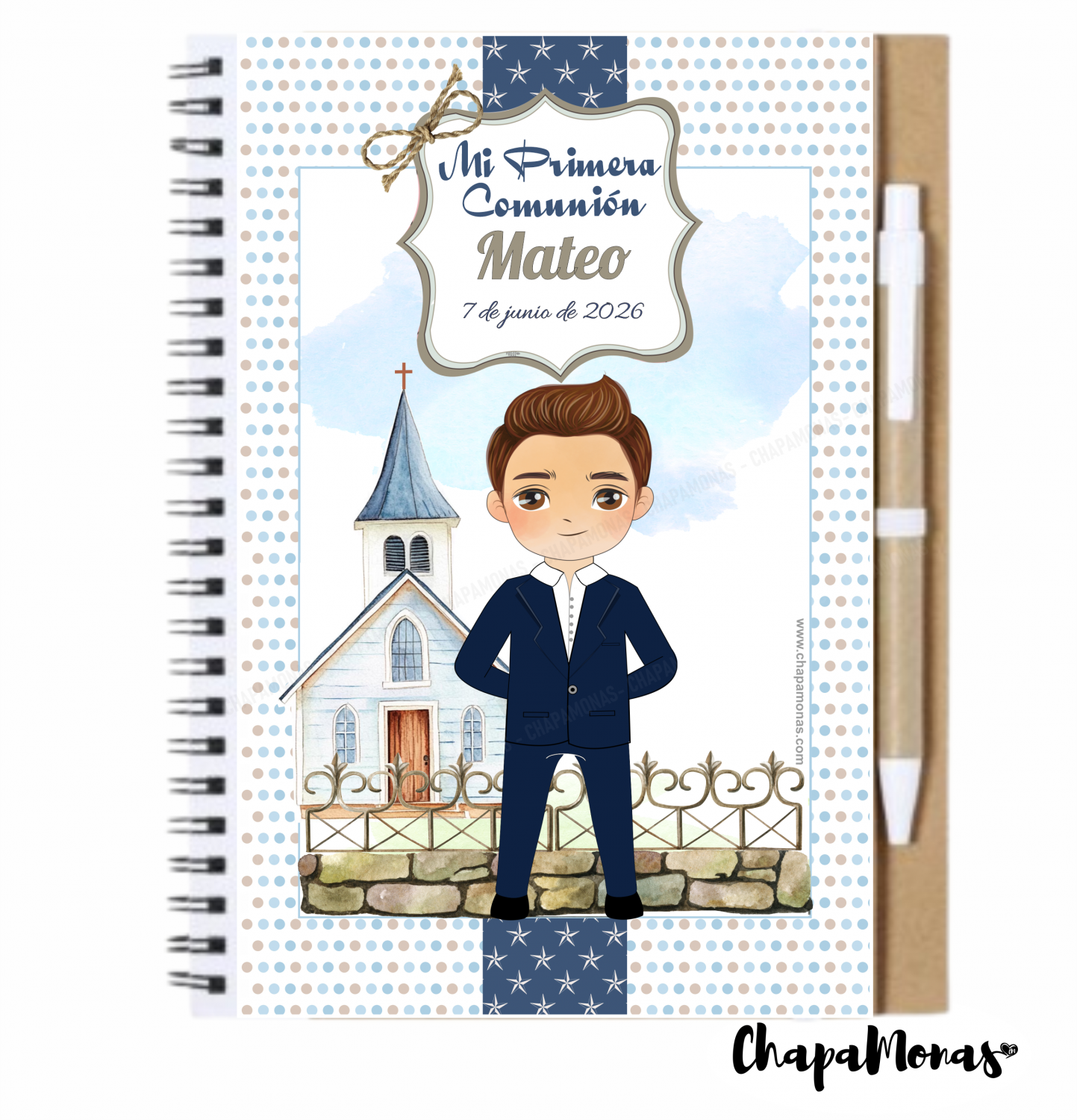 Libreta personalizada para primera comunión, Libreta con bolígrafo, se personalizara con nombre del niño, fecha de la comunión y muñequito!! Varios peinados disponibles, color de pelo, ojos, opción de incluir gafas y el trajecito que llevara en su día!!!
