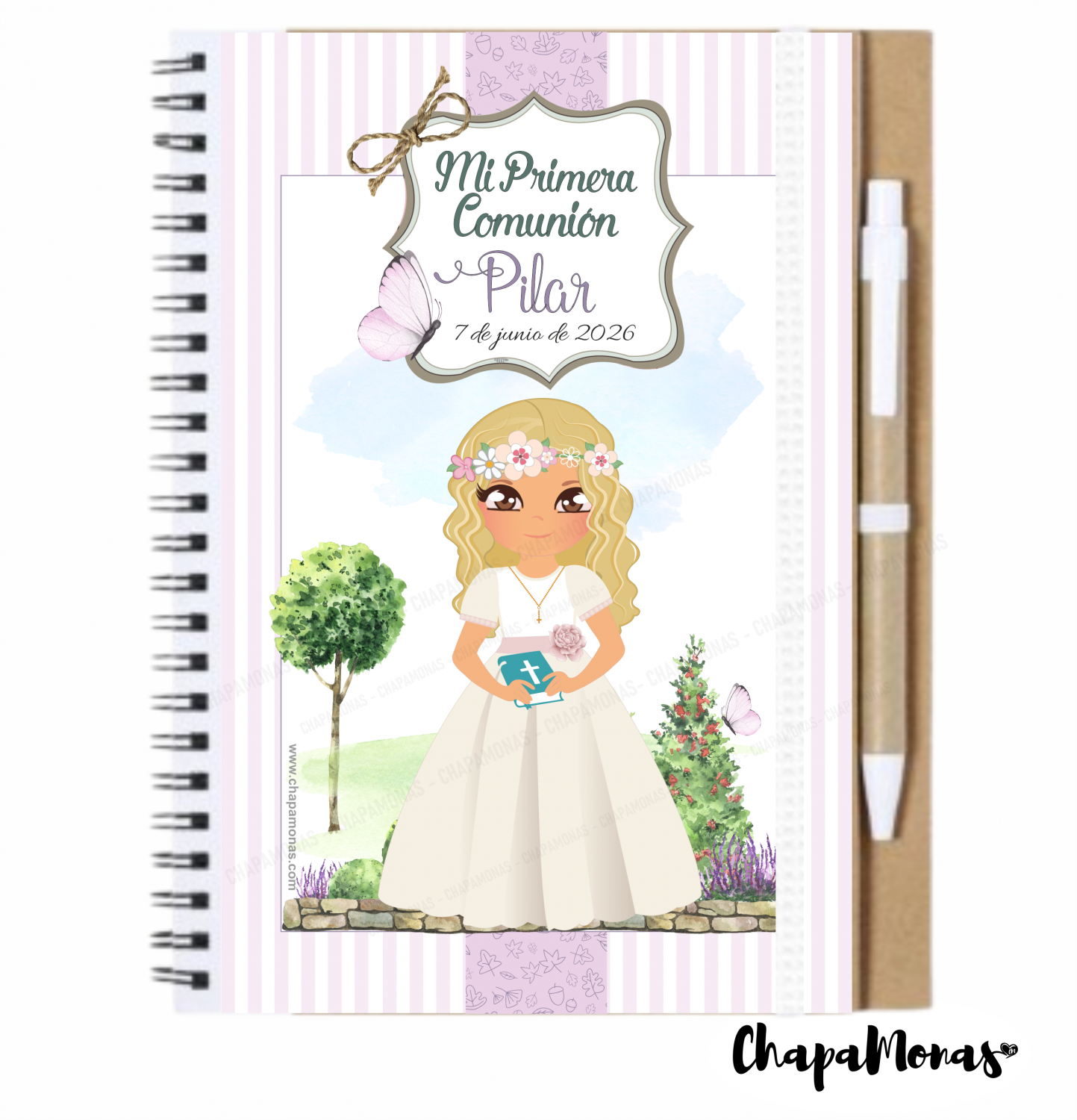 Libreta para primera comunión, libreta personalizada, Libreta con bolígrafo, se personalizara con nombre de la niña, fecha de la comunión y muñequita!! Varios peinados disponibles, color de pelo, ojos, accesorio para el cabello y vestido, opción de incluir gafas