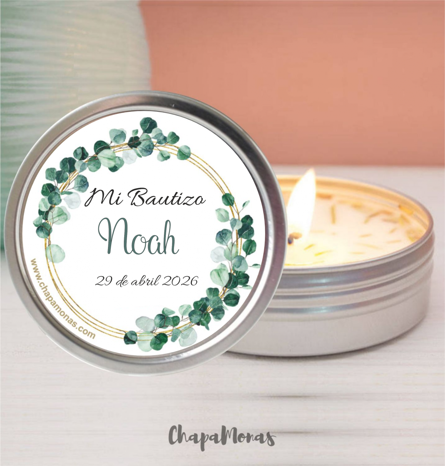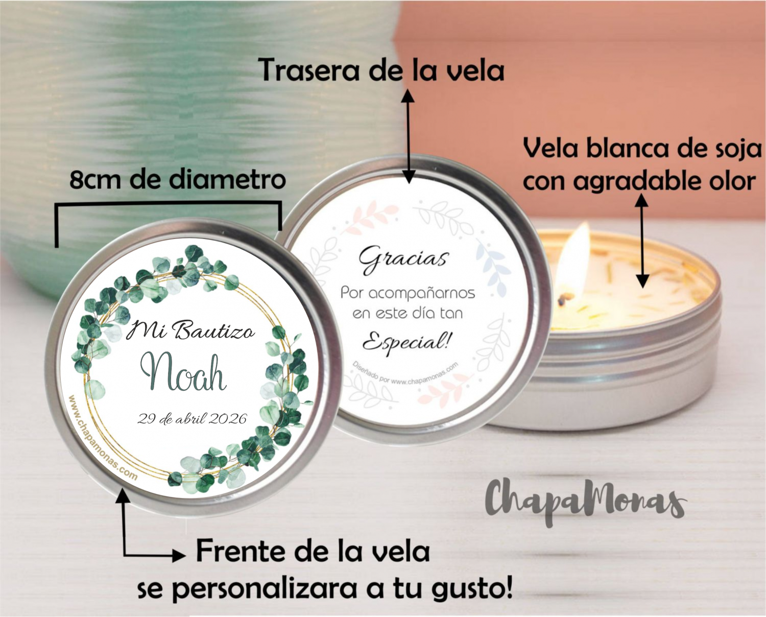 * La parte del frente de la vela en lata llevara pegatina personalizada y la parte de debajo de la vela en lata incluirá pegatina con frase de agradecimiento, podrás verlo en las fotografías adicionales.