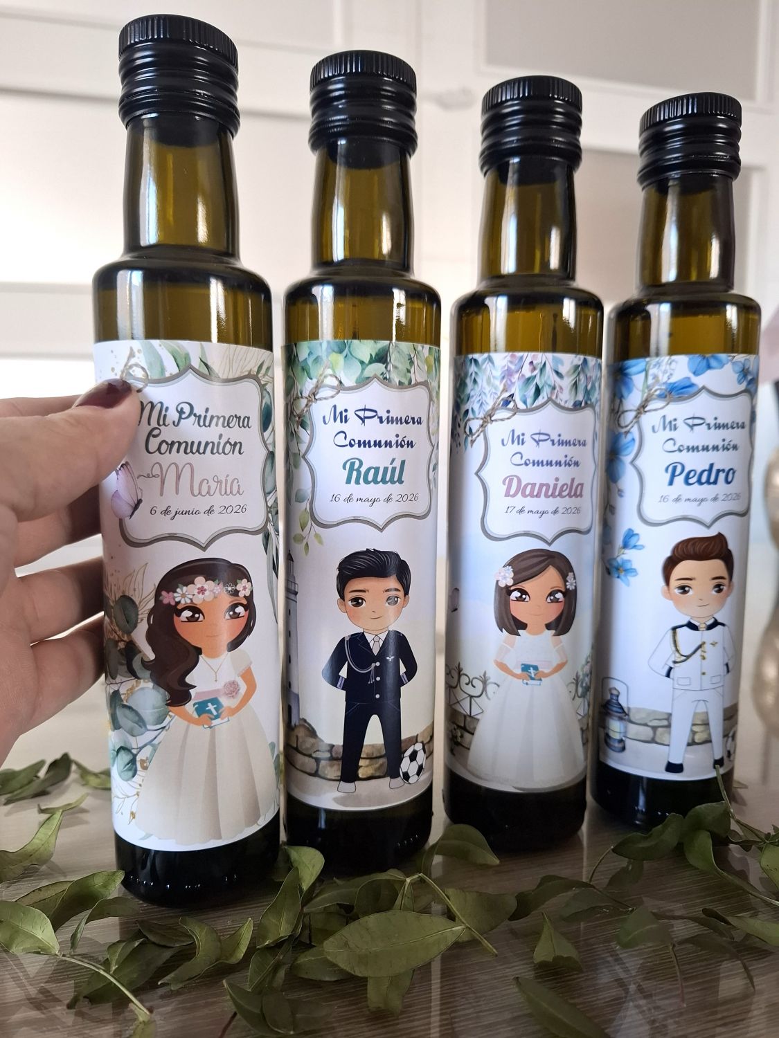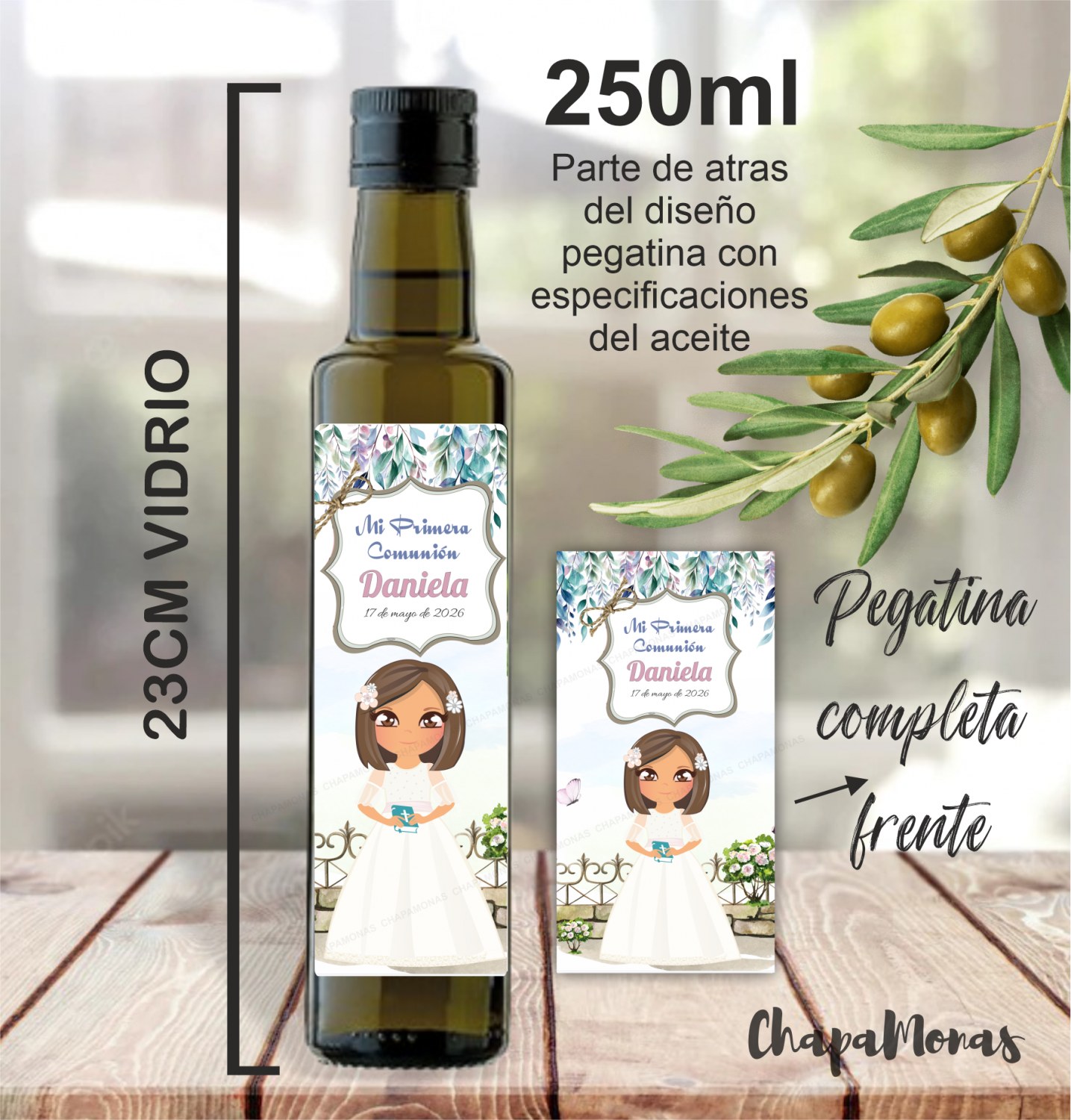 Cada botella incluye una pegatina personalizada con dibujo. La personalización puede realizarse con muñequita como la niña de la comunión, adaptando cuidadosamente: