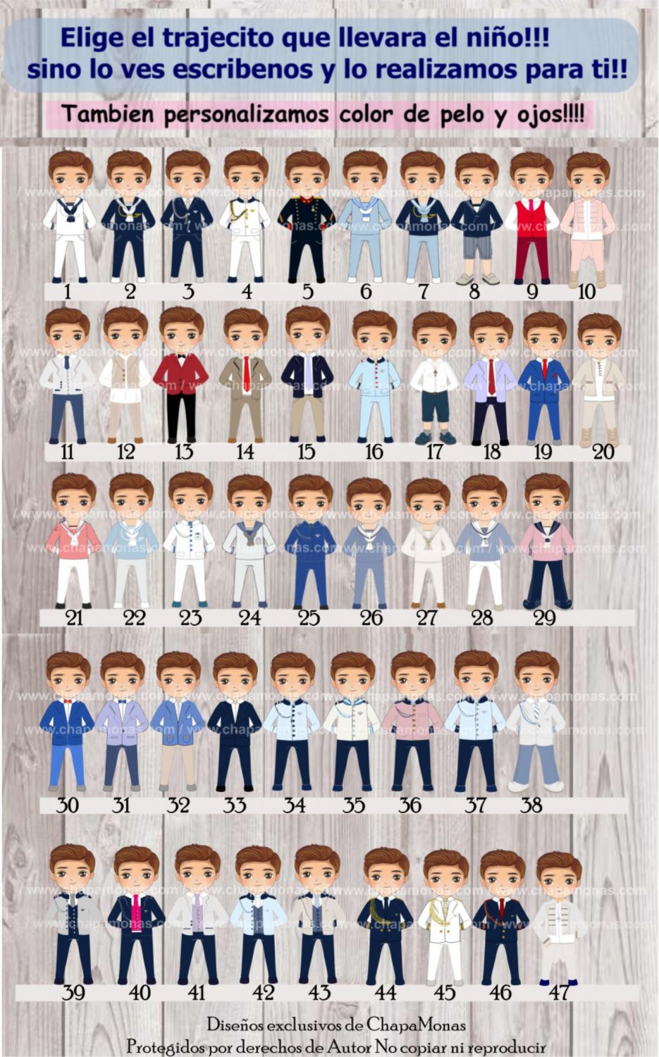 En las imágenes adicionales podrás ver los trajes y peinados disponibles y en "PERSONALIZACION DEL ARTICULO" nos lo escribes todo para que nuestro diseñador grafico realice el boceto. Antes de fabricar te enviaremos por Whatssap el montaje para saber si os gusta y esta todo ok.